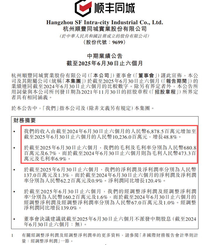 顺丰同城最近公布了2025年上半年的业绩,财报显示,顺丰同城上半年收入约102.36亿元,同比增长48.8%,中期收入首度破百亿大关。