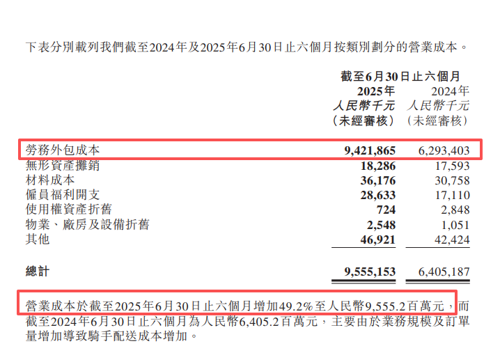 财报显示,今年上半年,顺丰同城的劳务外包成本达94.22亿元,占95.55亿元营业成本的大头。