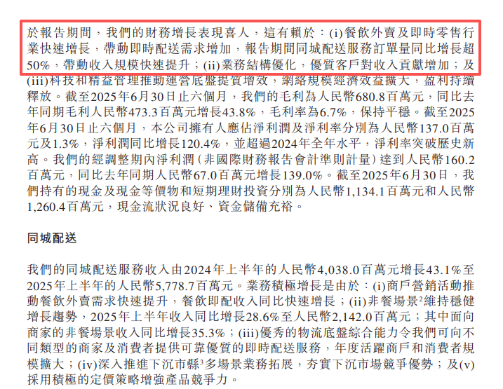 公告称,上述增长的原因主要为:餐饮外卖及即时零售行业快速增长,带动即时配送需求增加,期内同城配送服务订单量同比增长超50%,带动收入规模快速提升;业务结构优化,优质客户对收入贡献增加;以及其科技和精益管理推动运营底盘提质增效,网络规模经济效益扩大,盈利持续释放。